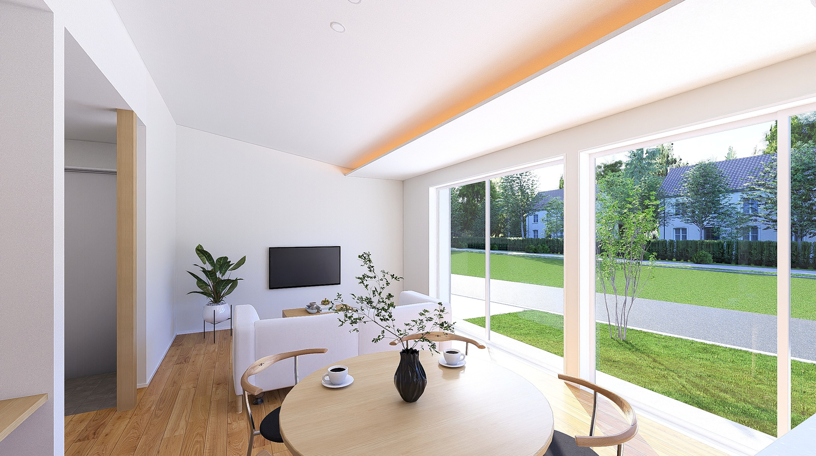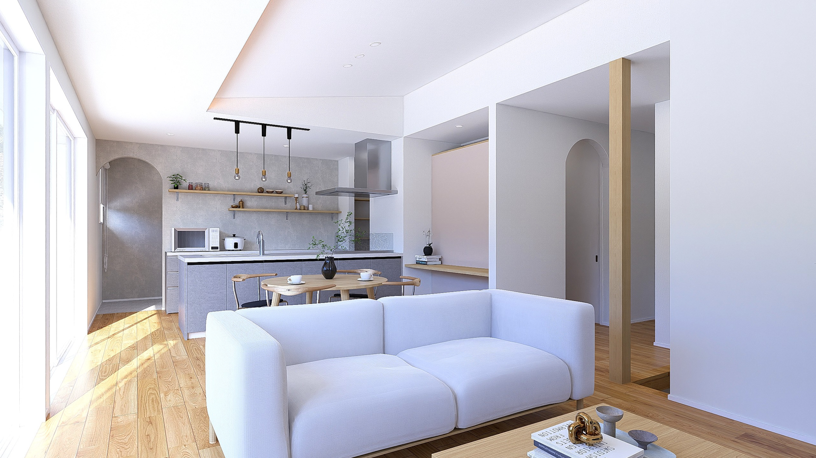 ① 光と広がりを感じるLDK空間大きな開口から自然光を取り込み、外と内がゆるやかにつながる設計。