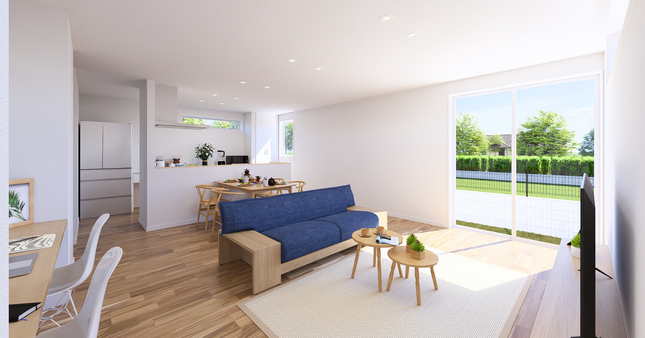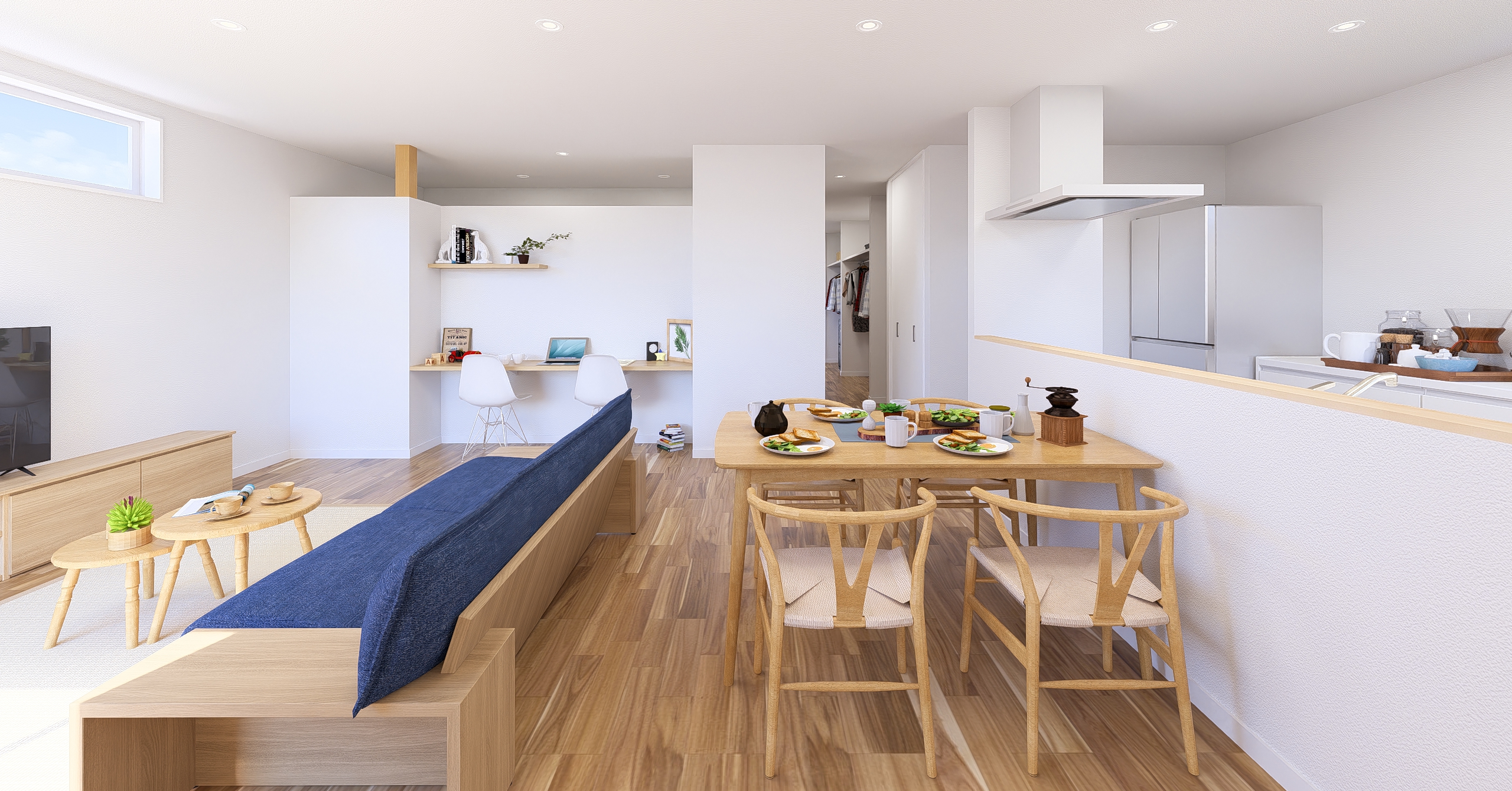 お家の中の中心には、20帖を超える広々としたリビング。家族みんながゆったりと笑顔で過ごせる場所です。そして、キッチンから洗面所へクルッと回れる便利な動線で、毎日の家事がぐっと楽になります。