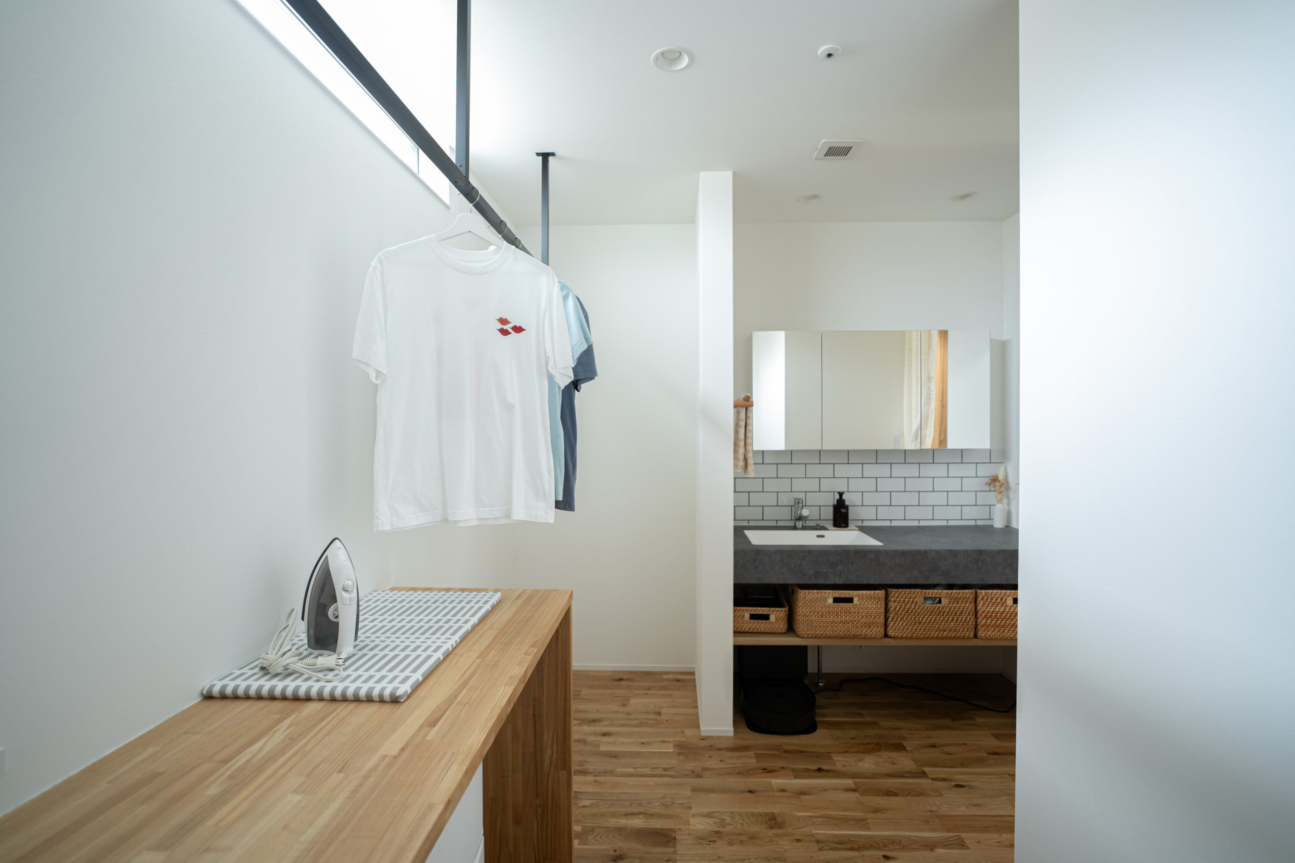 また、隣にあるウォークスルーのファミクロは通路代わりにもぴったりで、「動線的にも収納力の面でも、いろいろな意味で便利です。たたむ手間やシワを気にしなくていいので、ほぼ全面ハンガーパイプにして正解でした」と、こちらの使い勝手もお気に入りのご様子です。