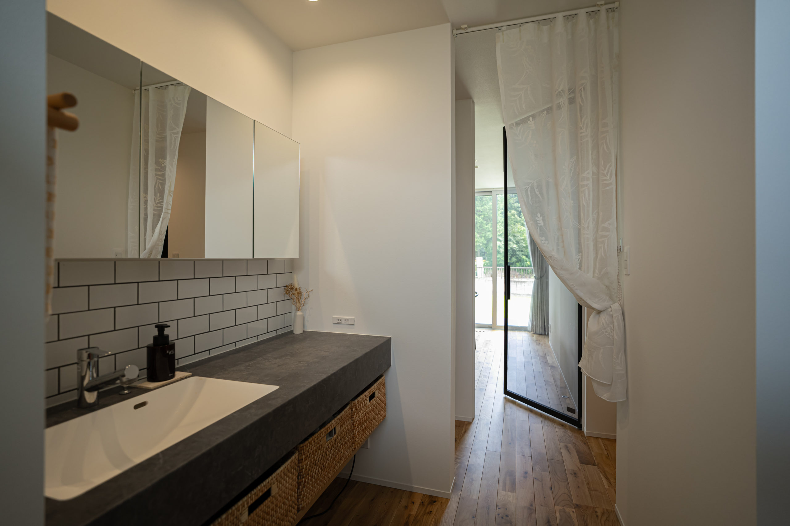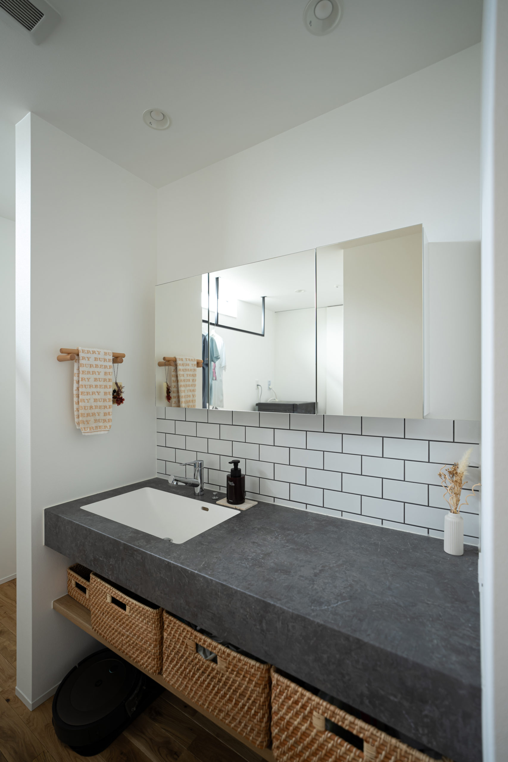 洗面室のデザインや、洗面室とバスルームの間に配されたランドリースペースも、夫人の希望を叶えたものです。「虫が苦手で室内干しが基本なので、ランドリースペースは絶対つくりたいと思っていました。洗濯がすごくラクになったし、天気も気にせず干せるので最高ですね」と夫人。「キレイを維持できるよう、苦手なお掃除もやる気になれます」と、お気に入りのデザインをあしらった空間は生活のモチベーションアップにもつながっているようです。