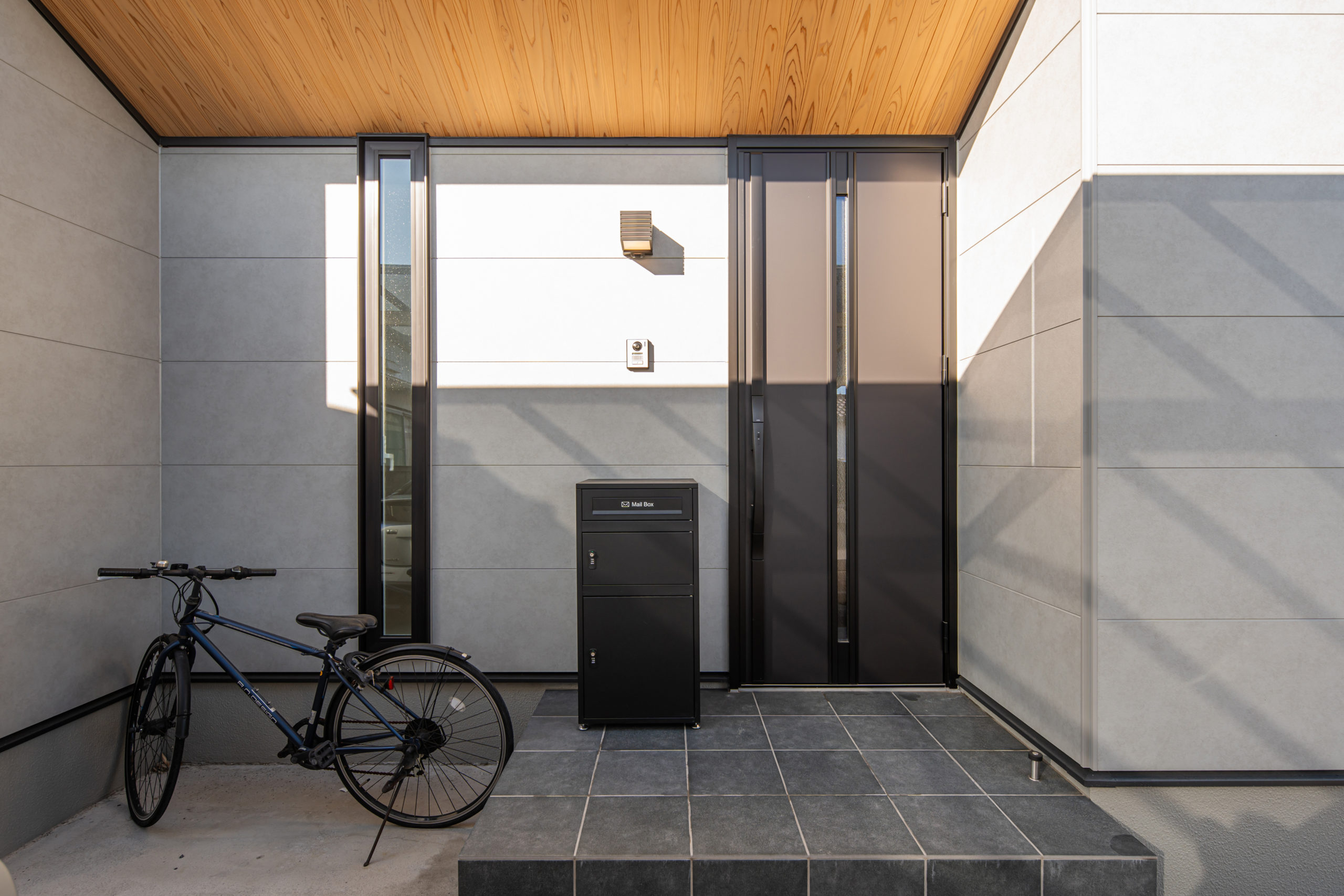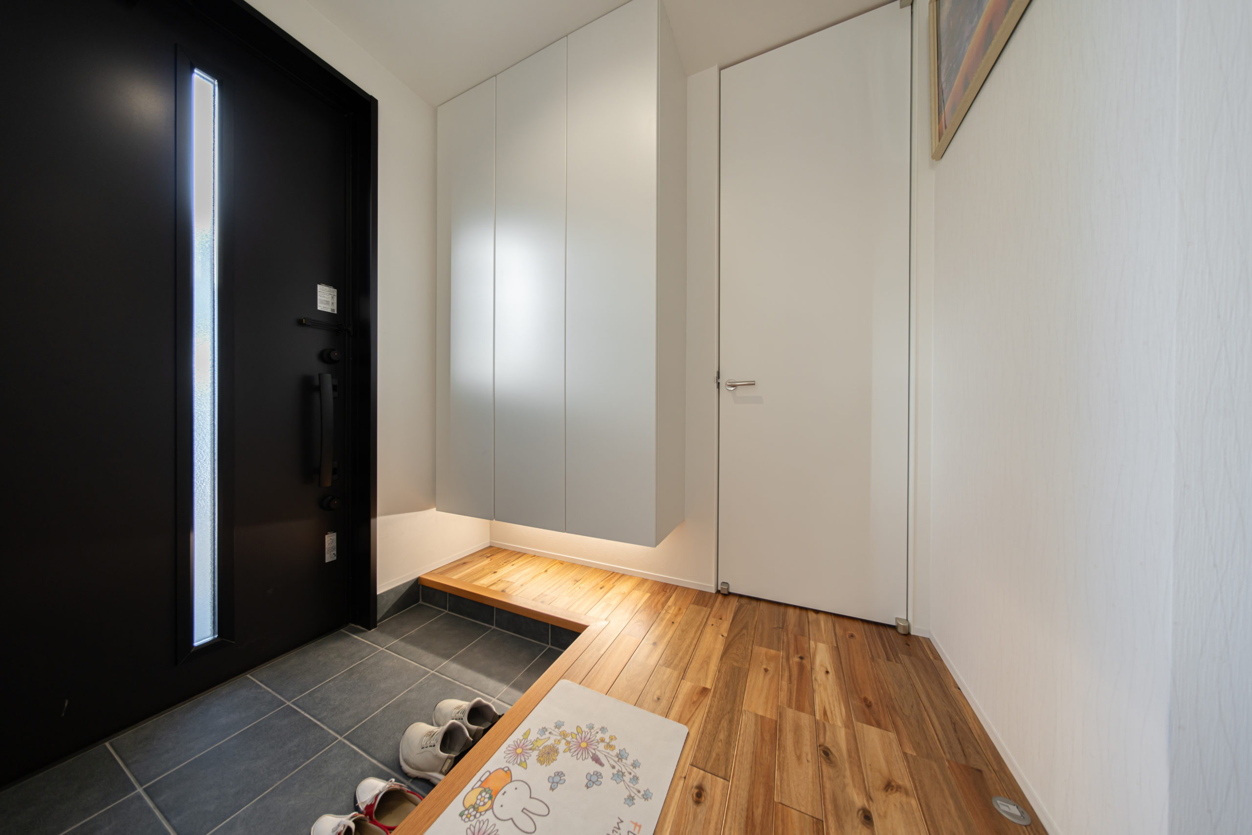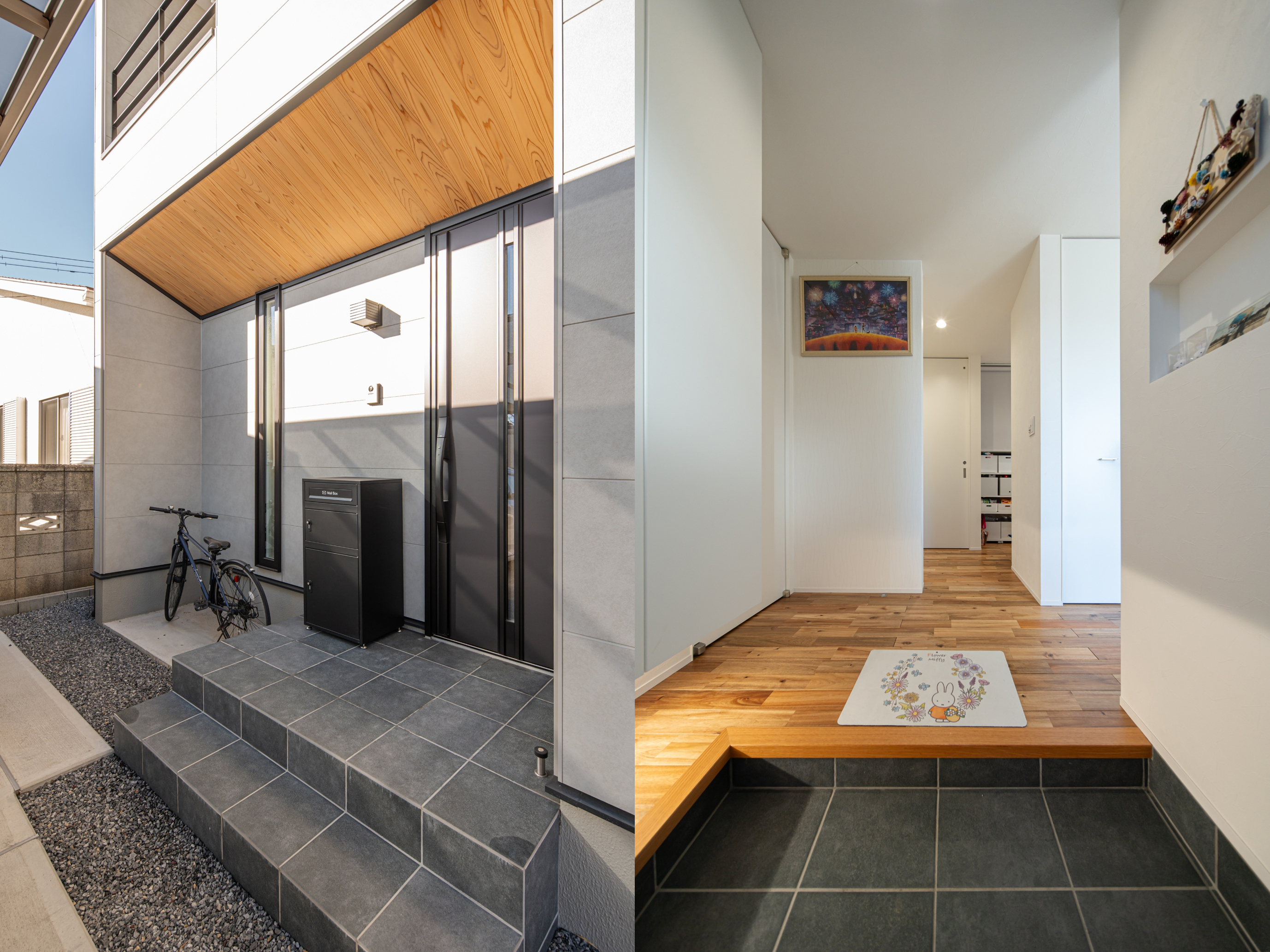 木目が印象的な玄関の軒天も、犬塚モデルハウスを参考に採用したお気に入りのデザインです。「ライトアップされた雰囲気がすごくかっこよくて、家のどこかに取り入れたいと相談して叶えてもらいました。表から見る玄関のデザインも、家の中に入った瞬間のホールの雰囲気も気に入っています」とKさん。