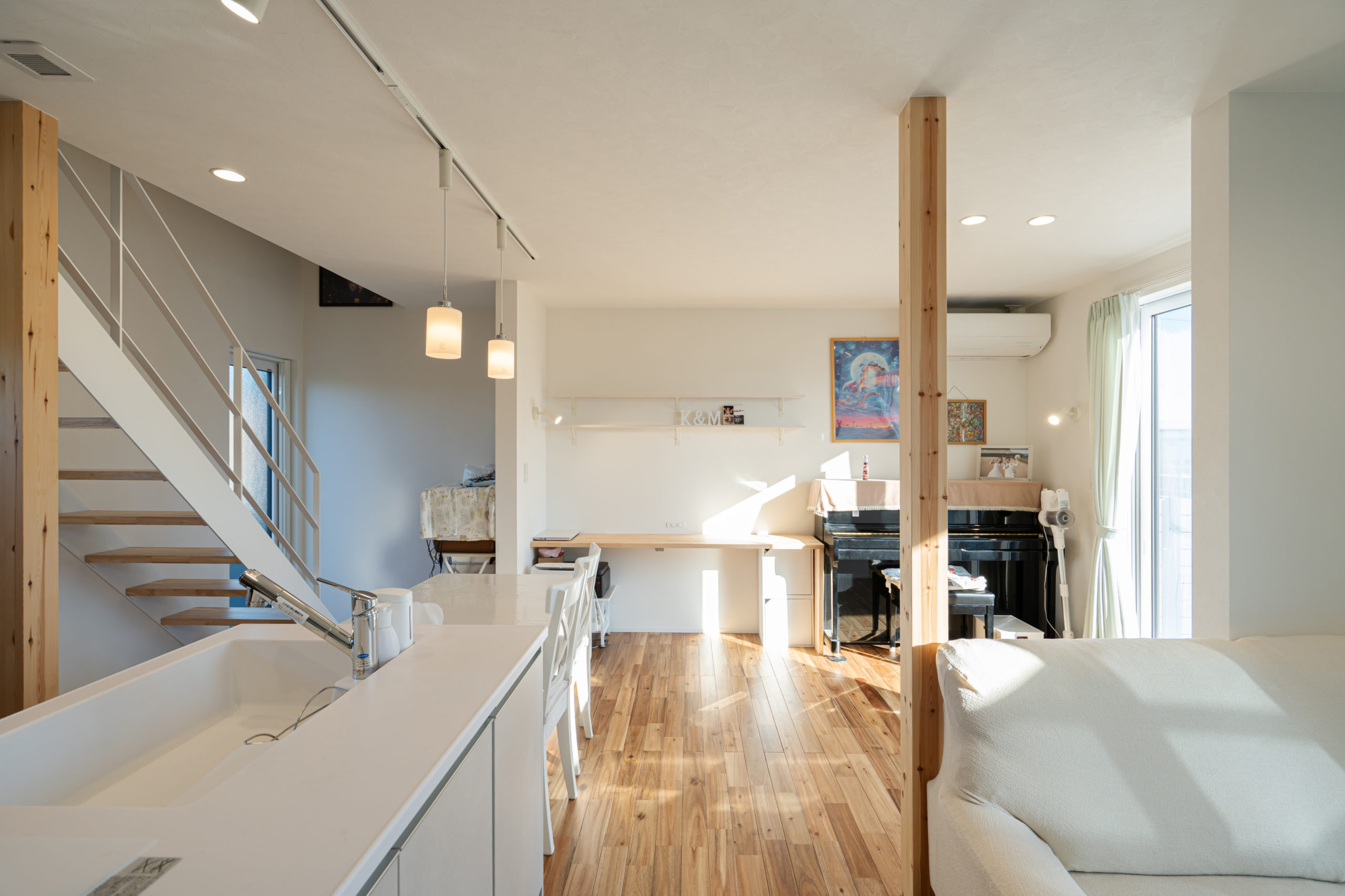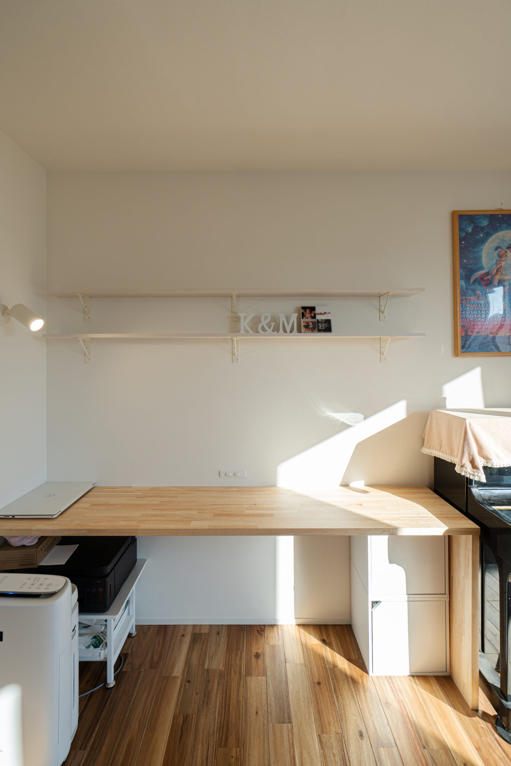 リビングの一角に造作したカウンターは、将来のスタディスペースです。「第一住宅で建てた家の完成見学会で、廊下にスタディスペースのある家を見て、共有スペースで勉強や宿題ができるのはいいなと思って。実家から持ってきたアップライトピアノの幅に合わせてカウンターデスクをつけてもらいました」と夫人。