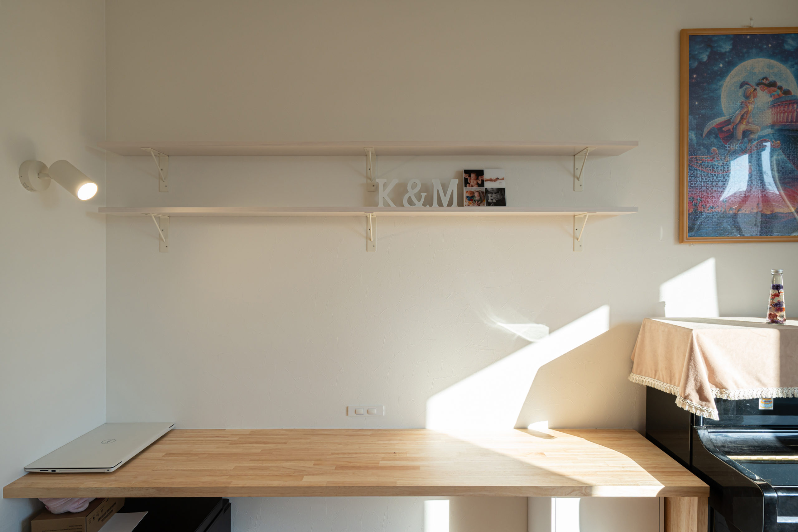 棚板も金具も白で統一した飾り棚やライト、コンセントもつけて準備は万端です。「この子が大きくなったらここで勉強するのかな、なんて想像すると幸せな気持ちになります。テラスも、テーブルセットを置いてお茶をしたり、プールを出して遊んだり、いろいろ楽しみたいですね」と、これからの暮らしにますます夢がふくらみます。