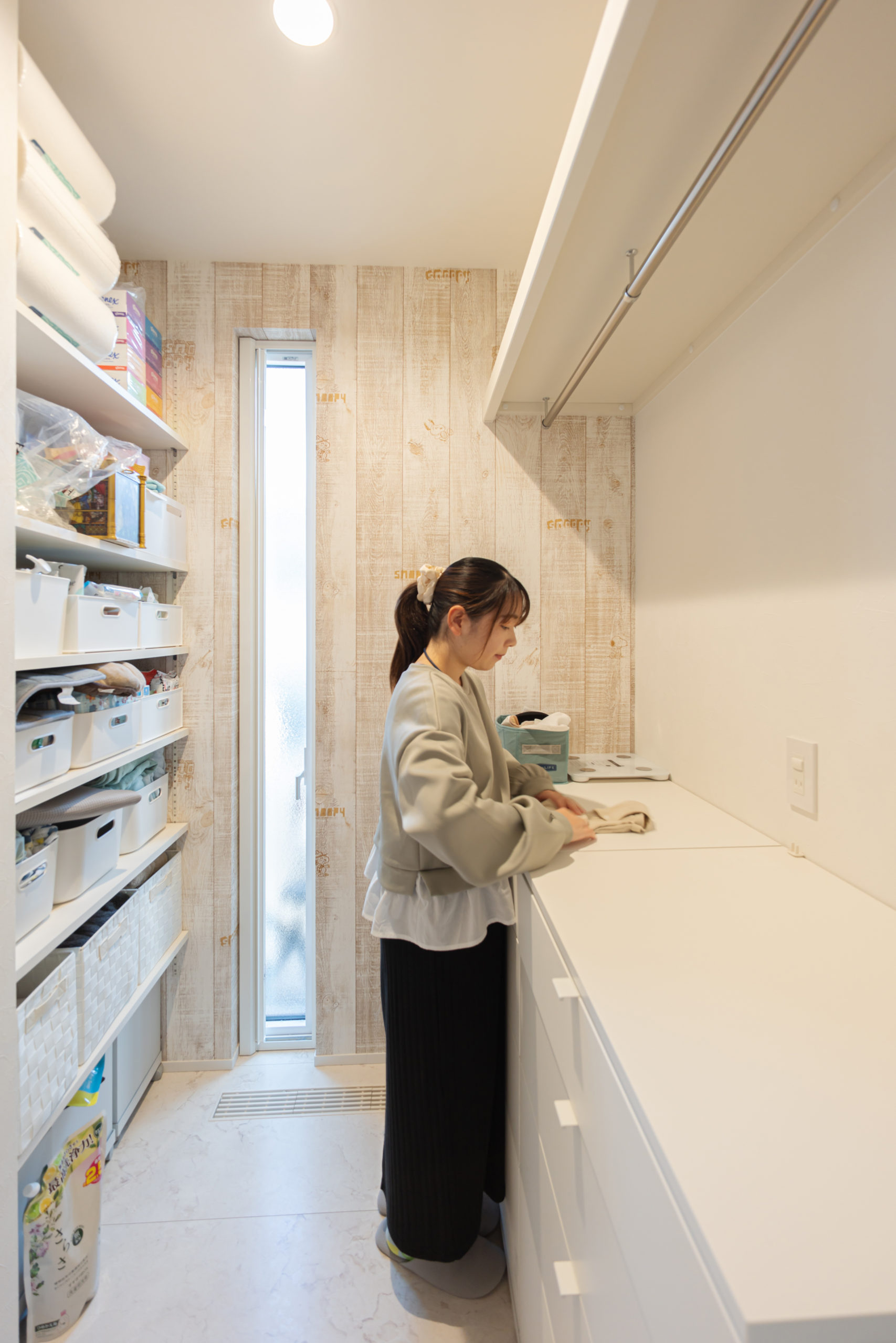 住まい全体は白を基調としながら、それぞれの居室やランドリースペース、トイレなどにアクセントクロスを採用。「決めることや選ぶものはたくさんありましたが、『こうしたい』と相談するとぽんぽんとアイデアを出してくれ、選んだものに対して『いいですね!』と返してくれるのですごく楽しく進めることができました」と夫人。お気に入りのキャラクターをあしらった柄や好きな色合いなど、たくさんの種類の中からひとつずつクロスを選び、場所ごとに雰囲気を変えたコーディネートを楽しんだそうです。